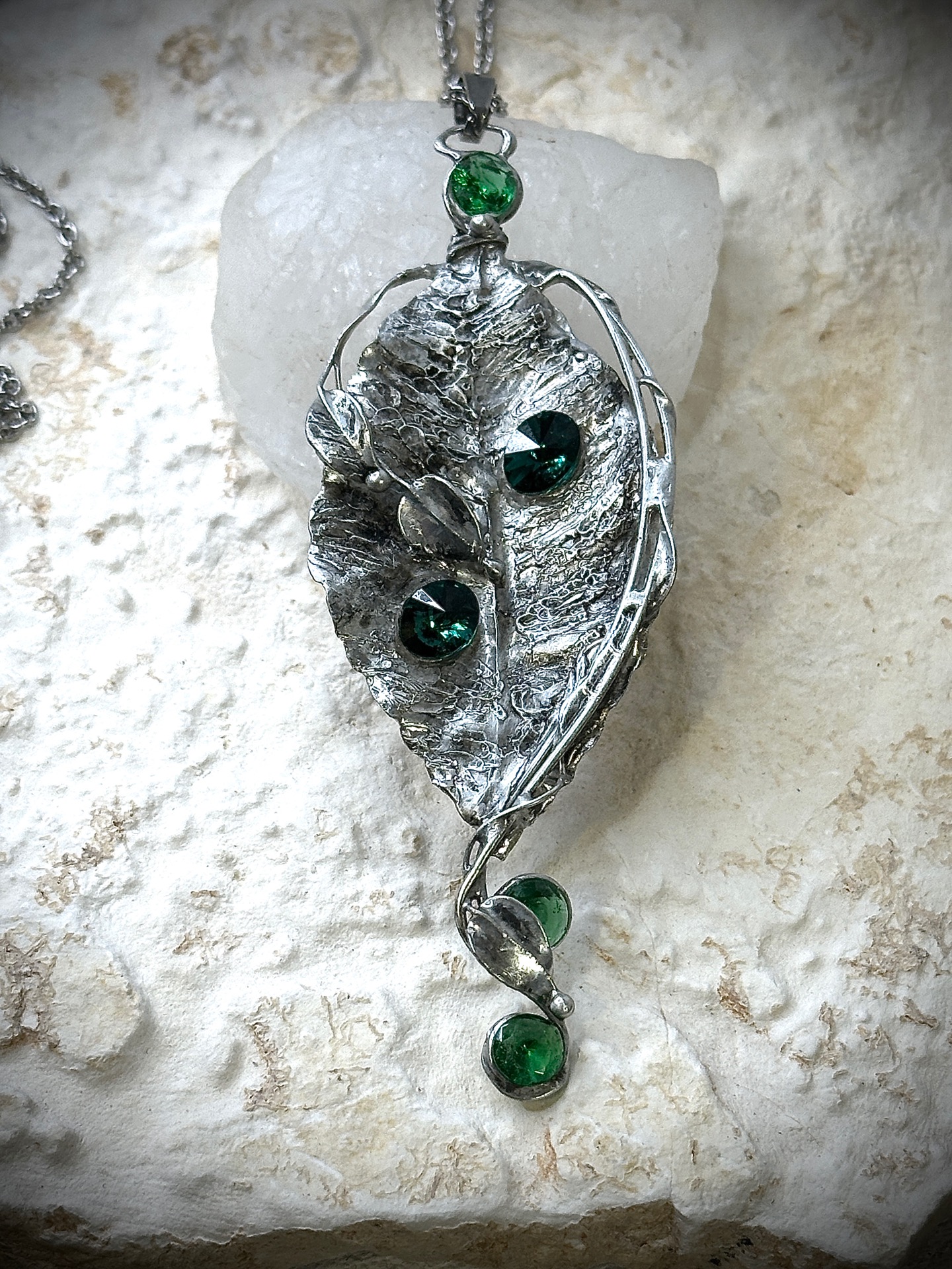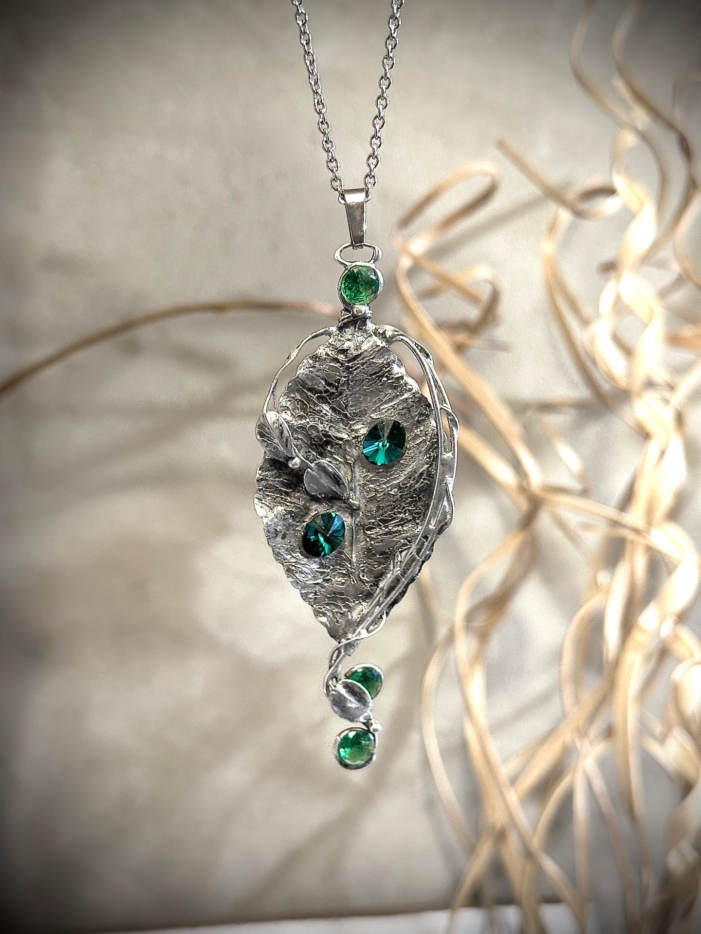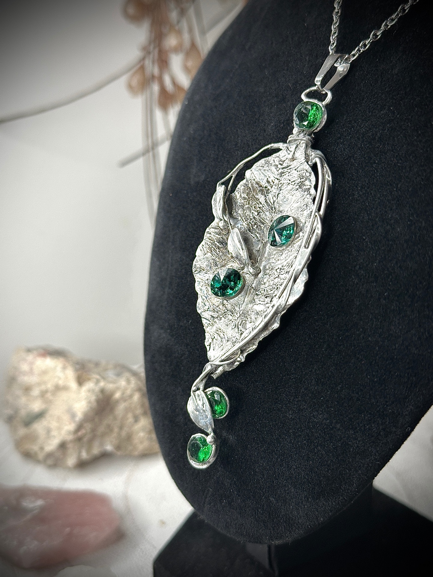 Cínovaný šperk, kde se organická struktura listu potkává s hlubokým zeleným třpytem Swarovski kamenů. Každý detail jsem tvarovala tak, aby působil jako součást živoucí přírody – jemné větvičky, drobné lístky a světlo, které se v kamenech láme jako ranní kapky rosy.