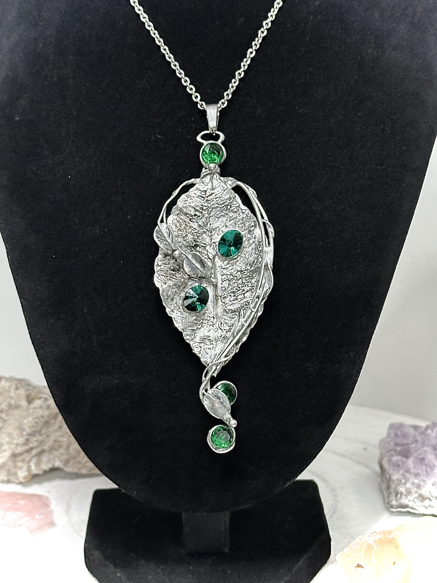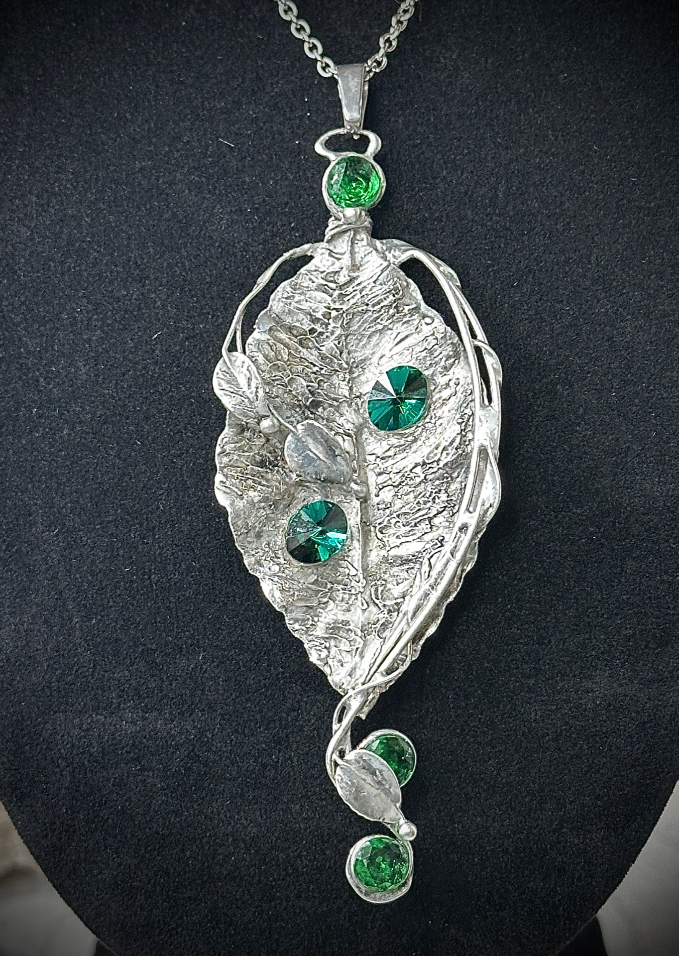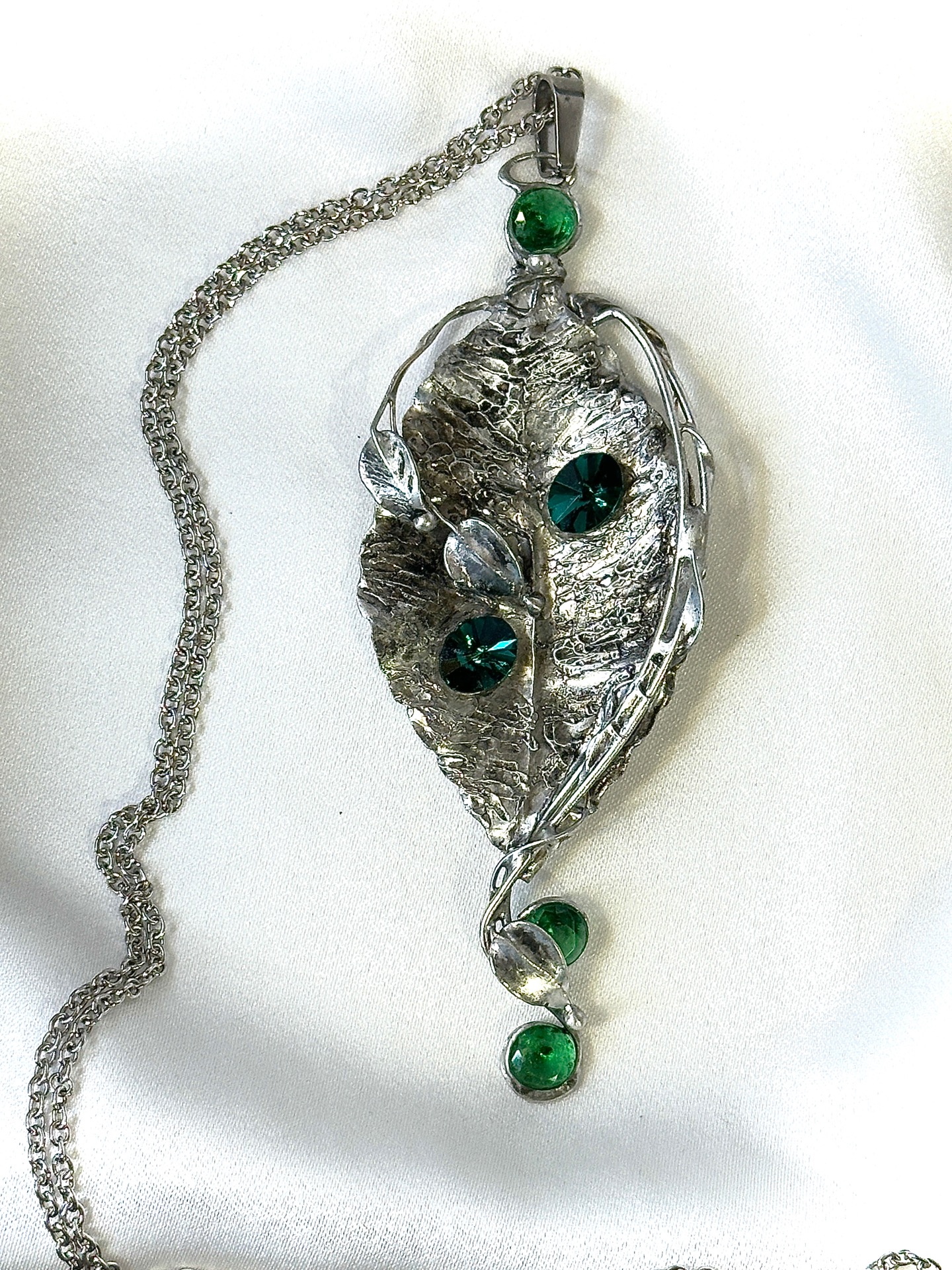 Cínovaný šperk, kde se organická struktura listu potkává s hlubokým zeleným třpytem Swarovski kamenů. Každý detail jsem tvarovala tak, aby působil jako součást živoucí přírody – jemné větvičky, drobné lístky a světlo, které se v kamenech láme jako ranní kapky rosy.