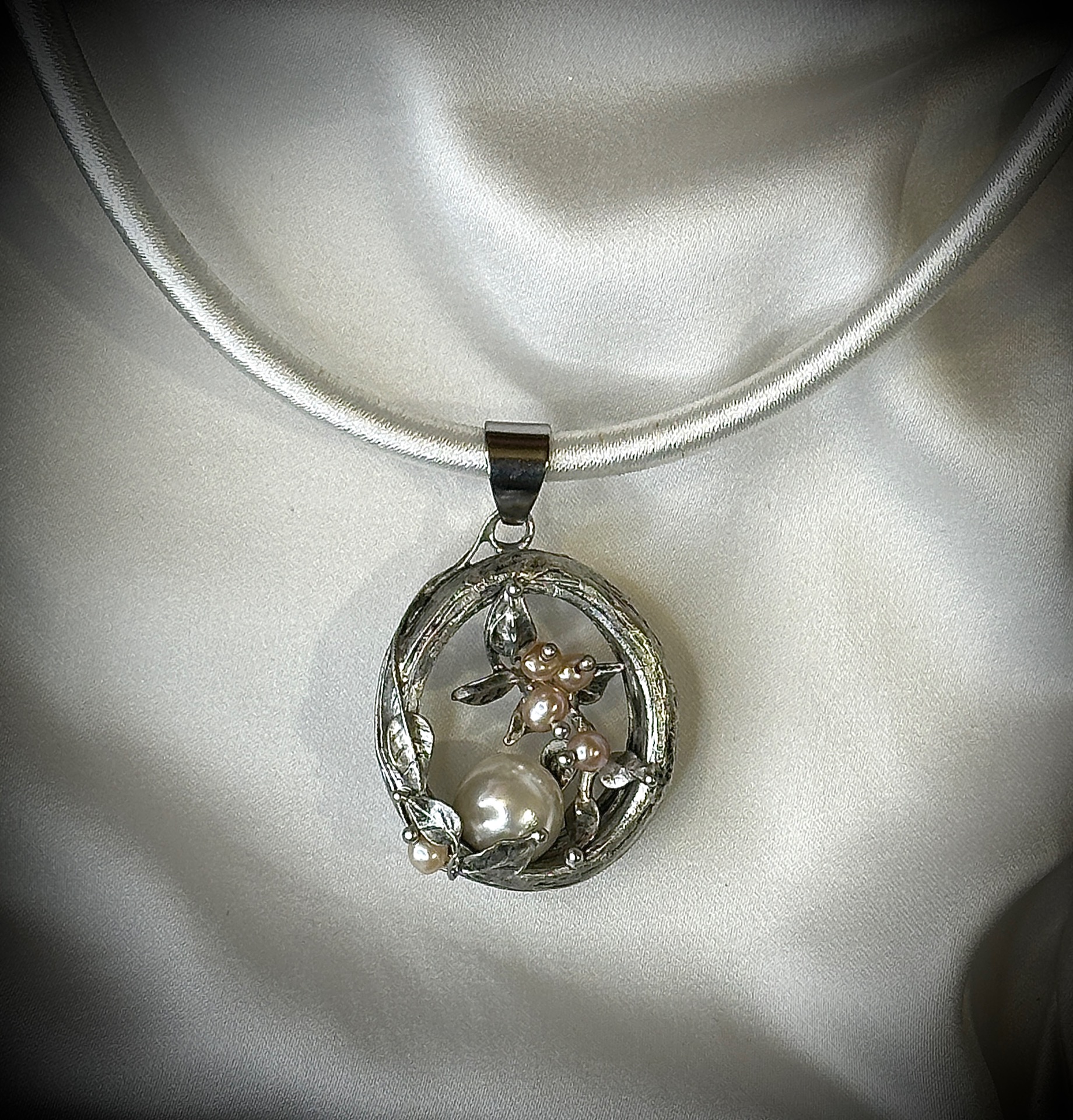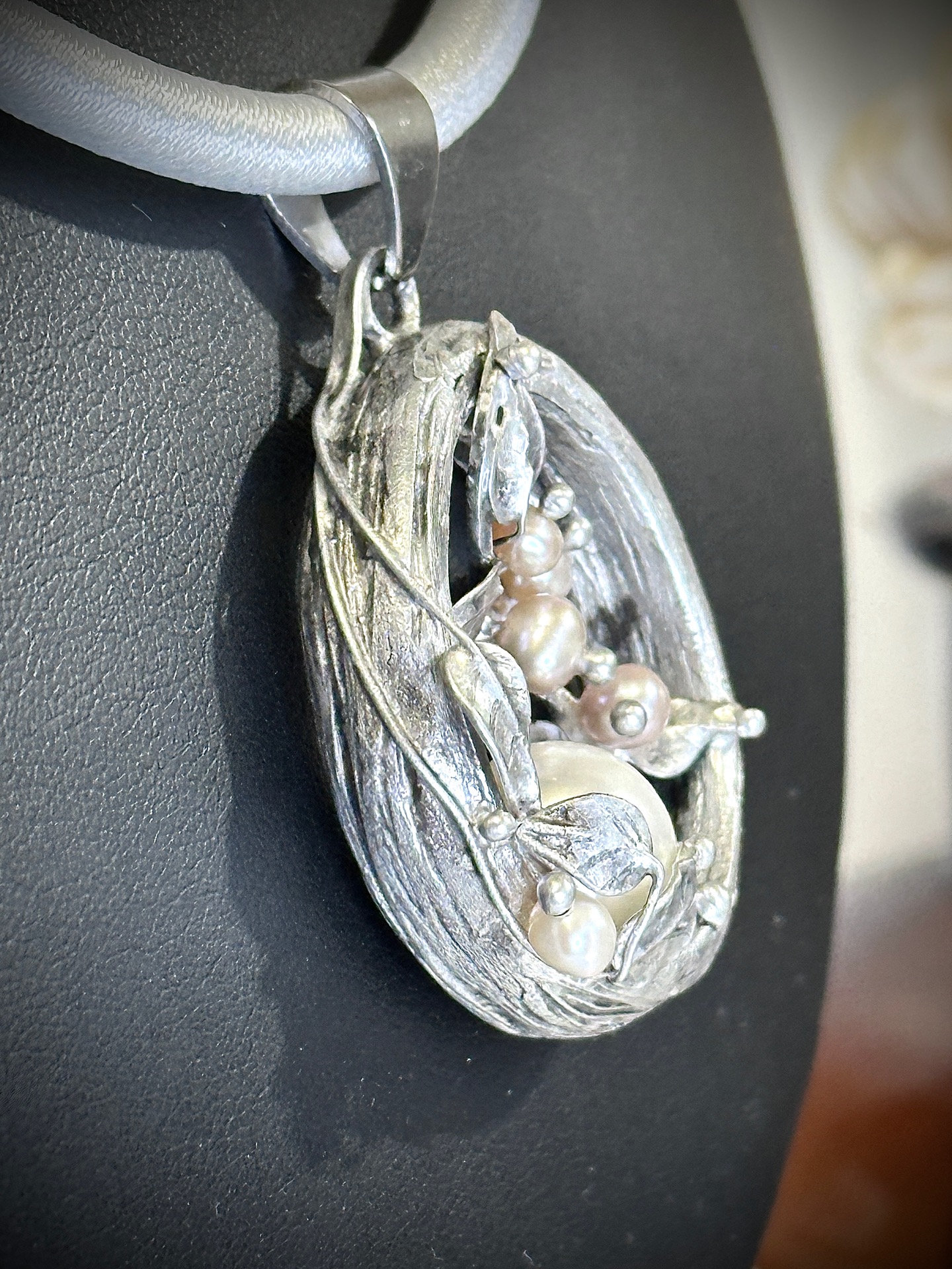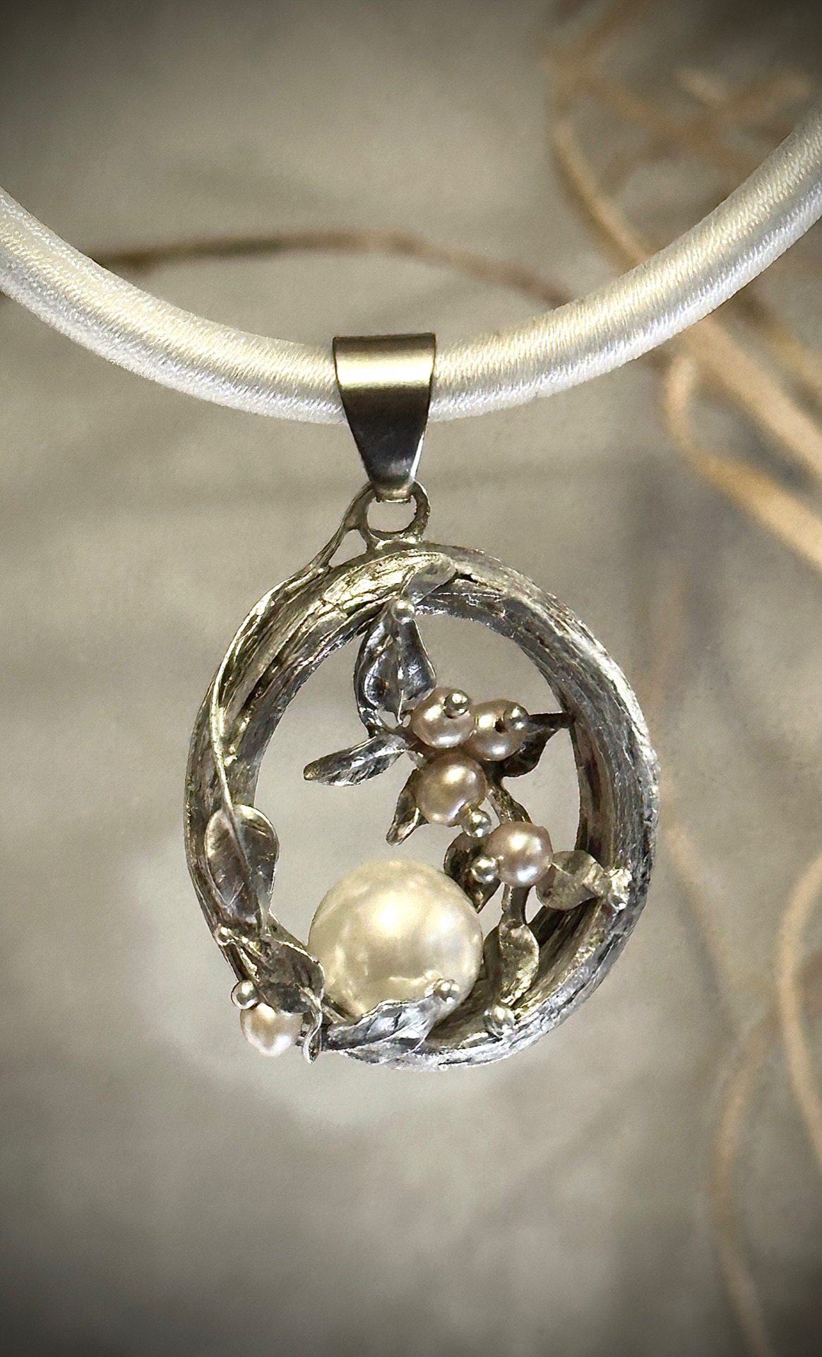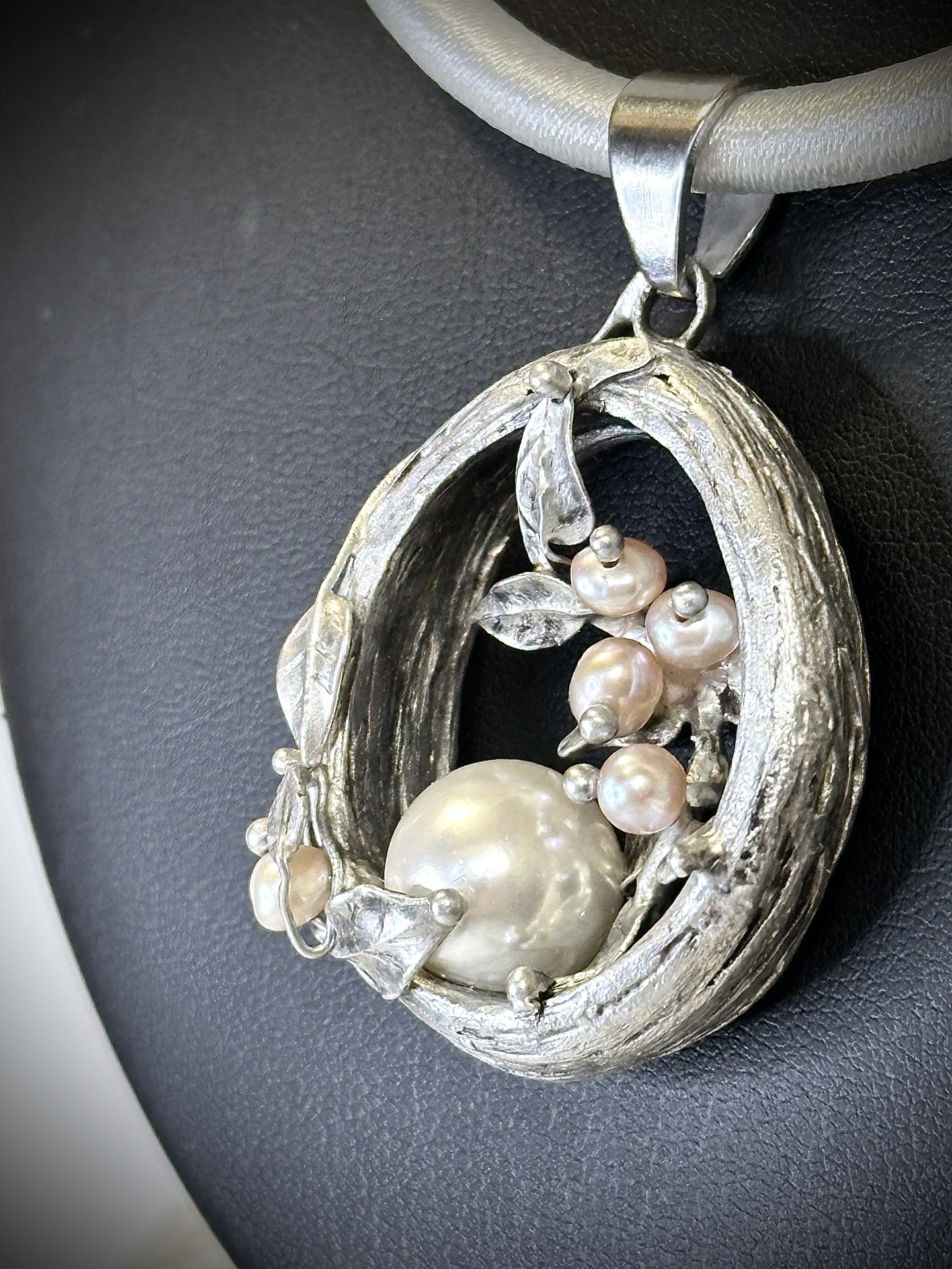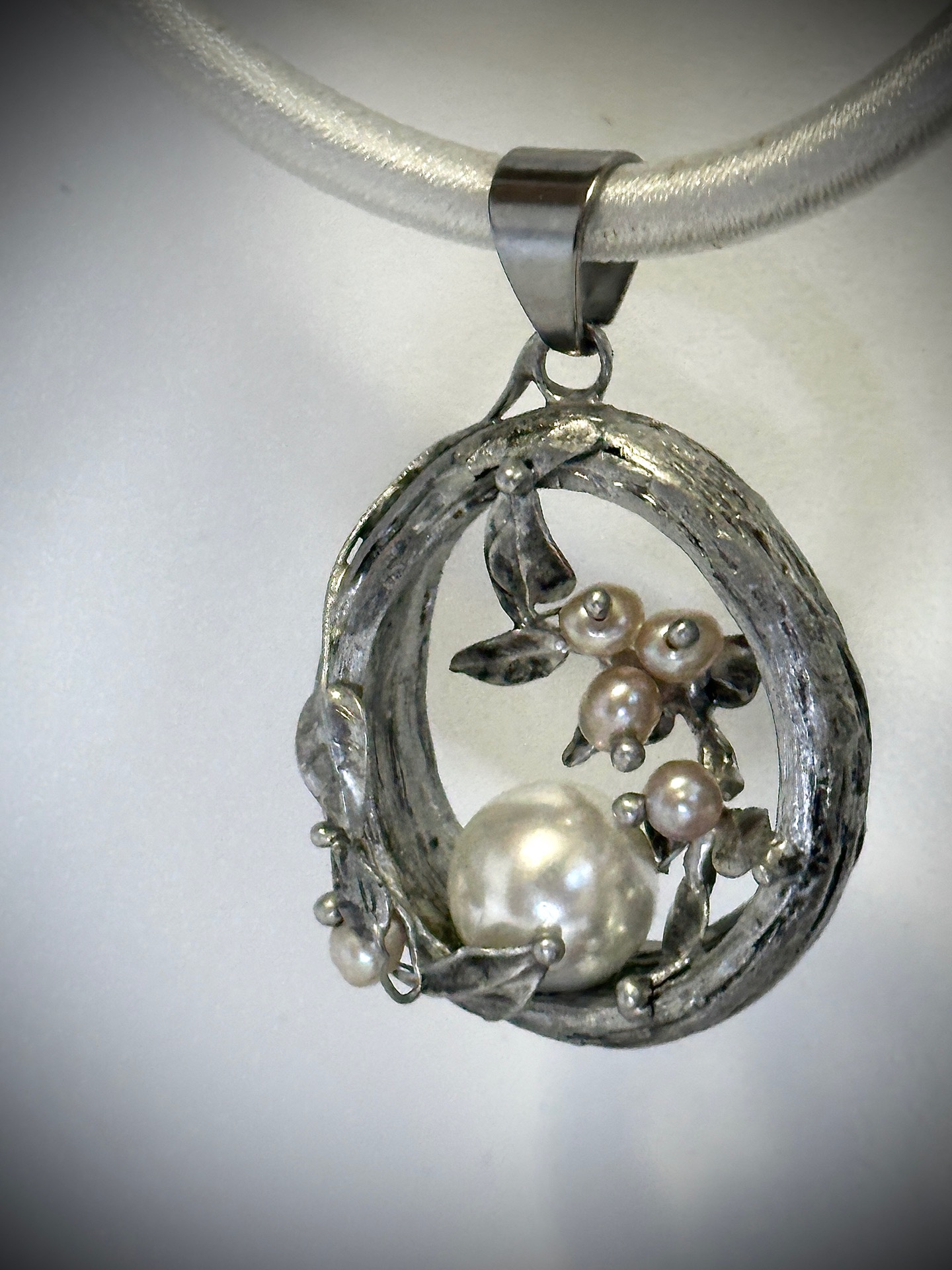 Tento autorský šperk vznikl s velkou péčí a láskou k detailu. Struktura připomínající jemné dřevo, drobné lístky a perličky ukryté mezi nimi – vše je ručně modelované tak, aby celek působil lehce, živě a organicky. Každý pohled odhalí nový detail, kterého si člověk možná napoprvé ani nevšimne.
