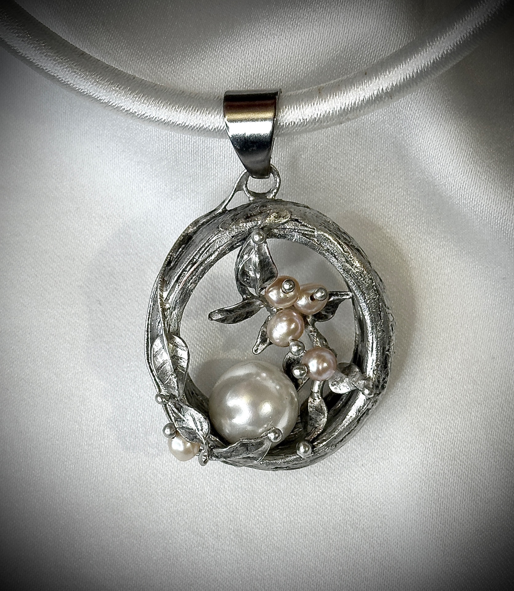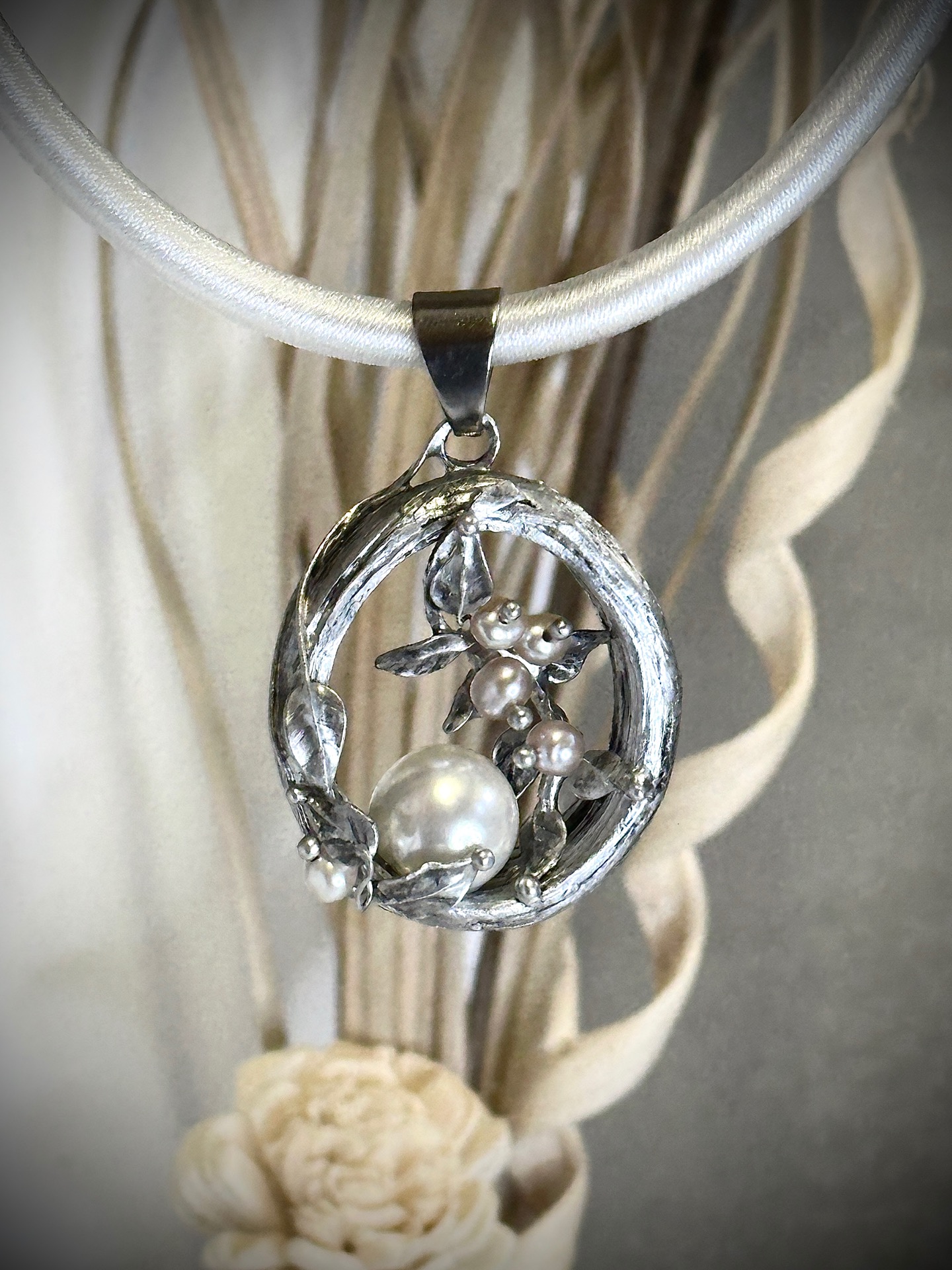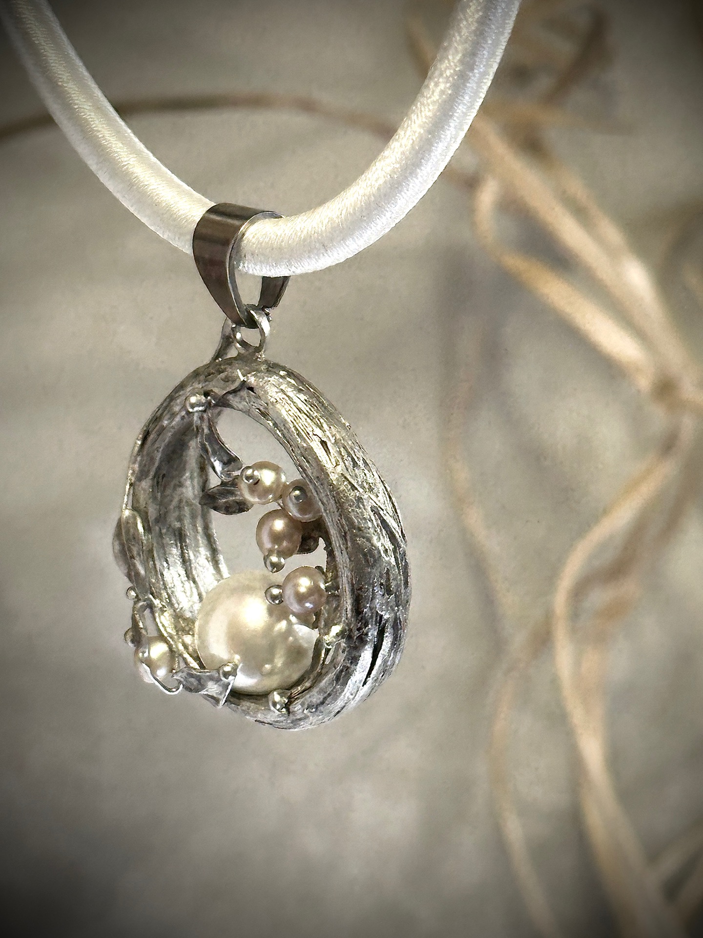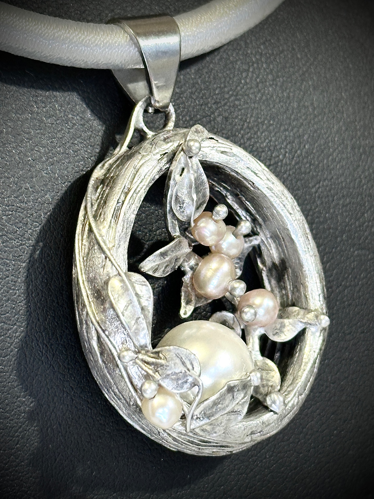 Tento autorský šperk vznikl s velkou péčí a láskou k detailu. Struktura připomínající jemné dřevo, drobné lístky a perličky ukryté mezi nimi – vše je ručně modelované tak, aby celek působil lehce, živě a organicky. Každý pohled odhalí nový detail, kterého si člověk možná napoprvé ani nevšimne.