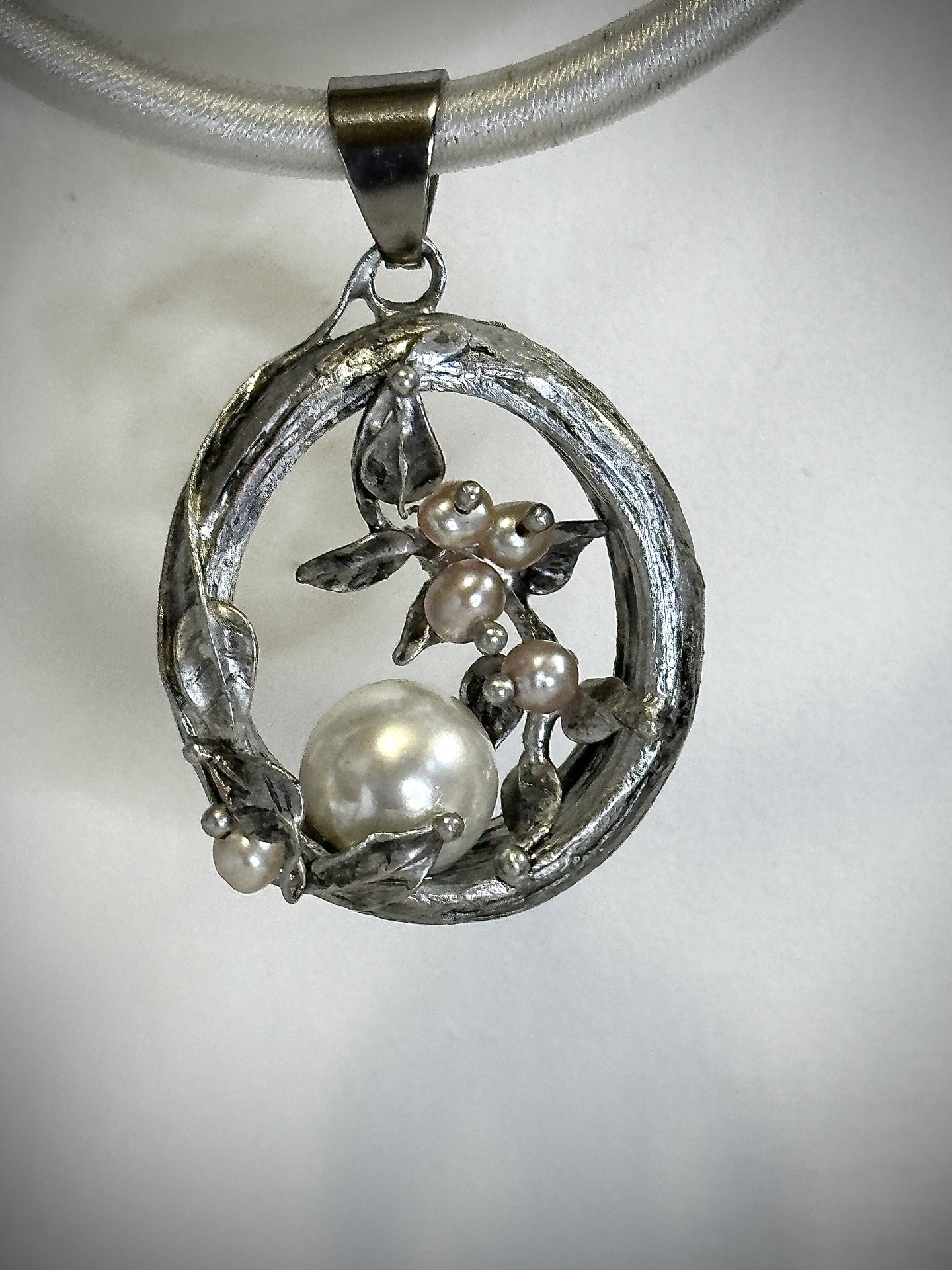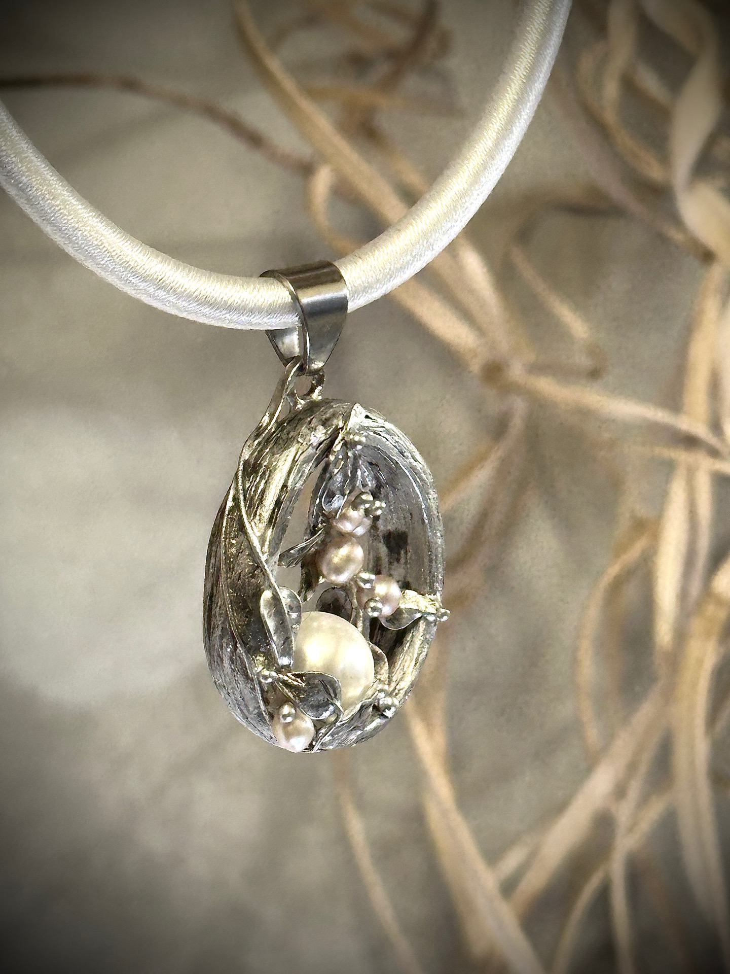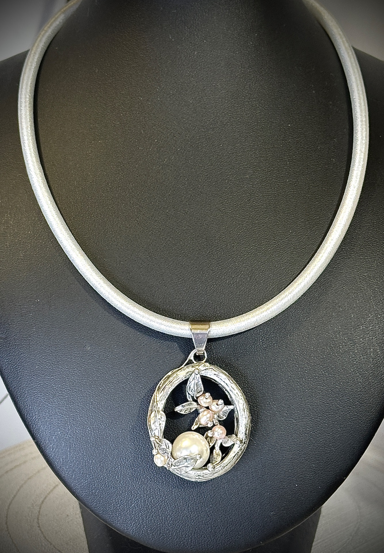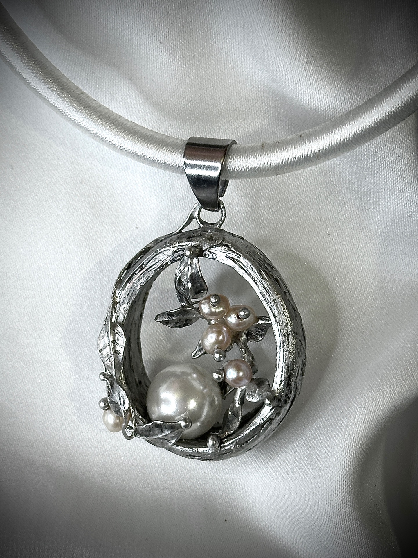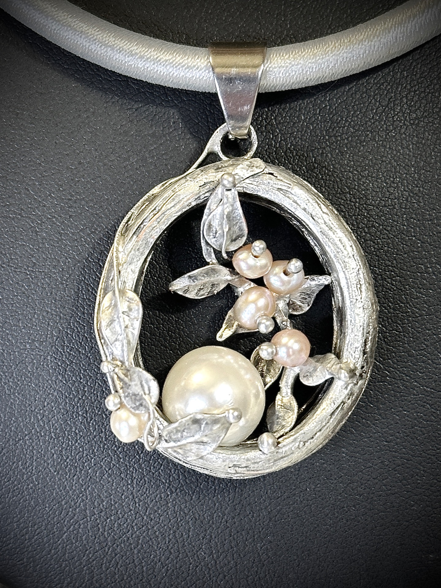 Tento autorský šperk vznikl s velkou péčí a láskou k detailu. Struktura připomínající jemné dřevo, drobné lístky a perličky ukryté mezi nimi – vše je ručně modelované tak, aby celek působil lehce, živě a organicky. Každý pohled odhalí nový detail, kterého si člověk možná napoprvé ani nevšimne.
