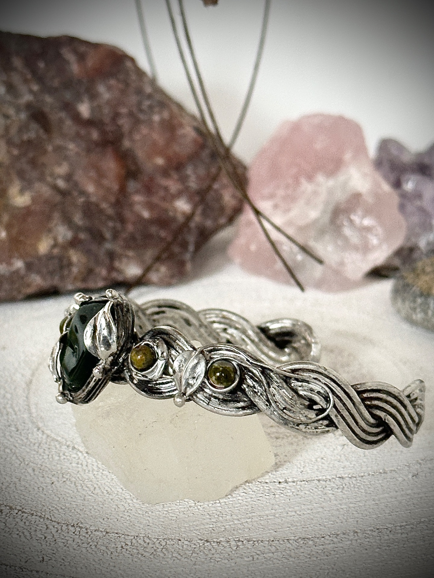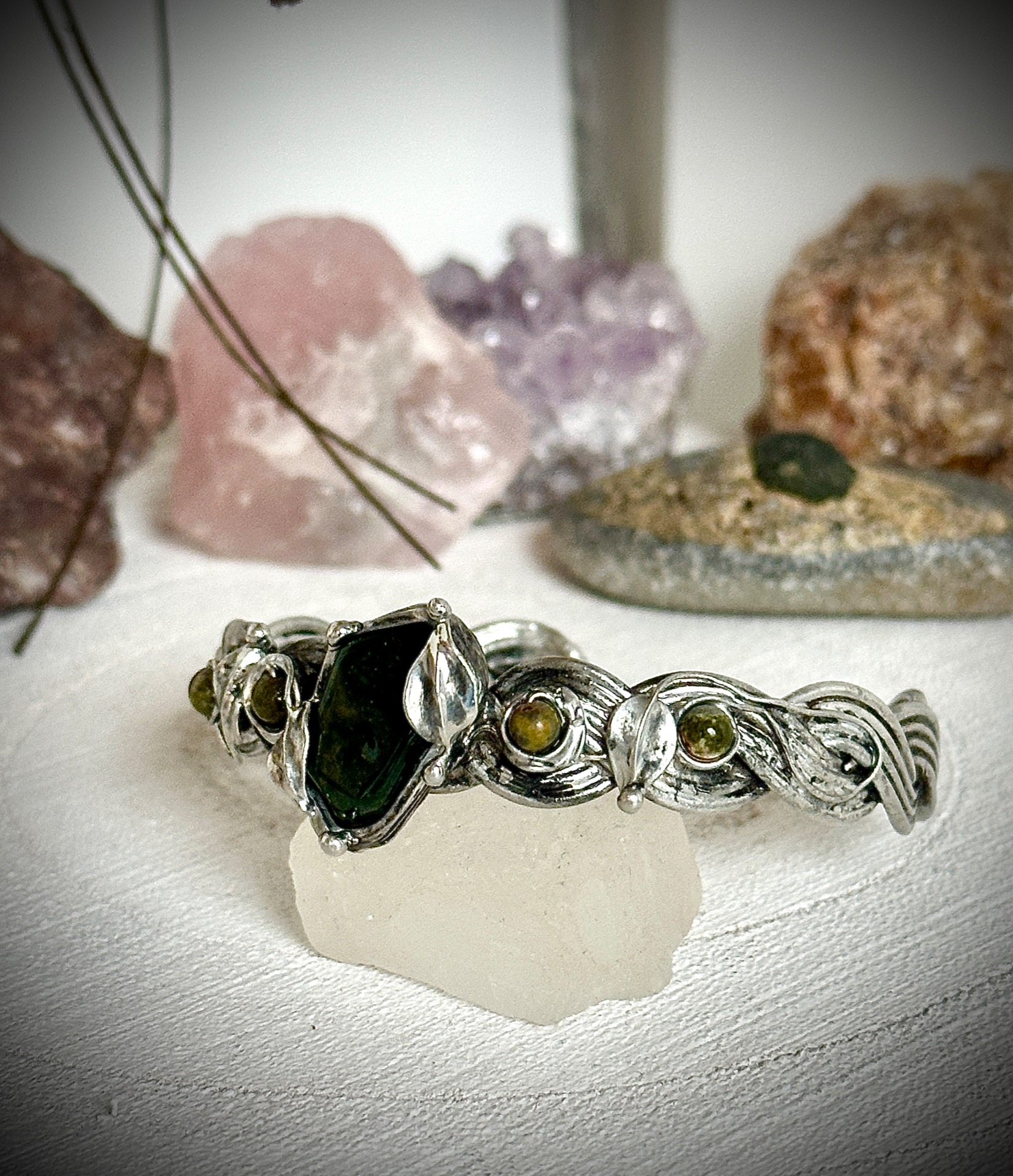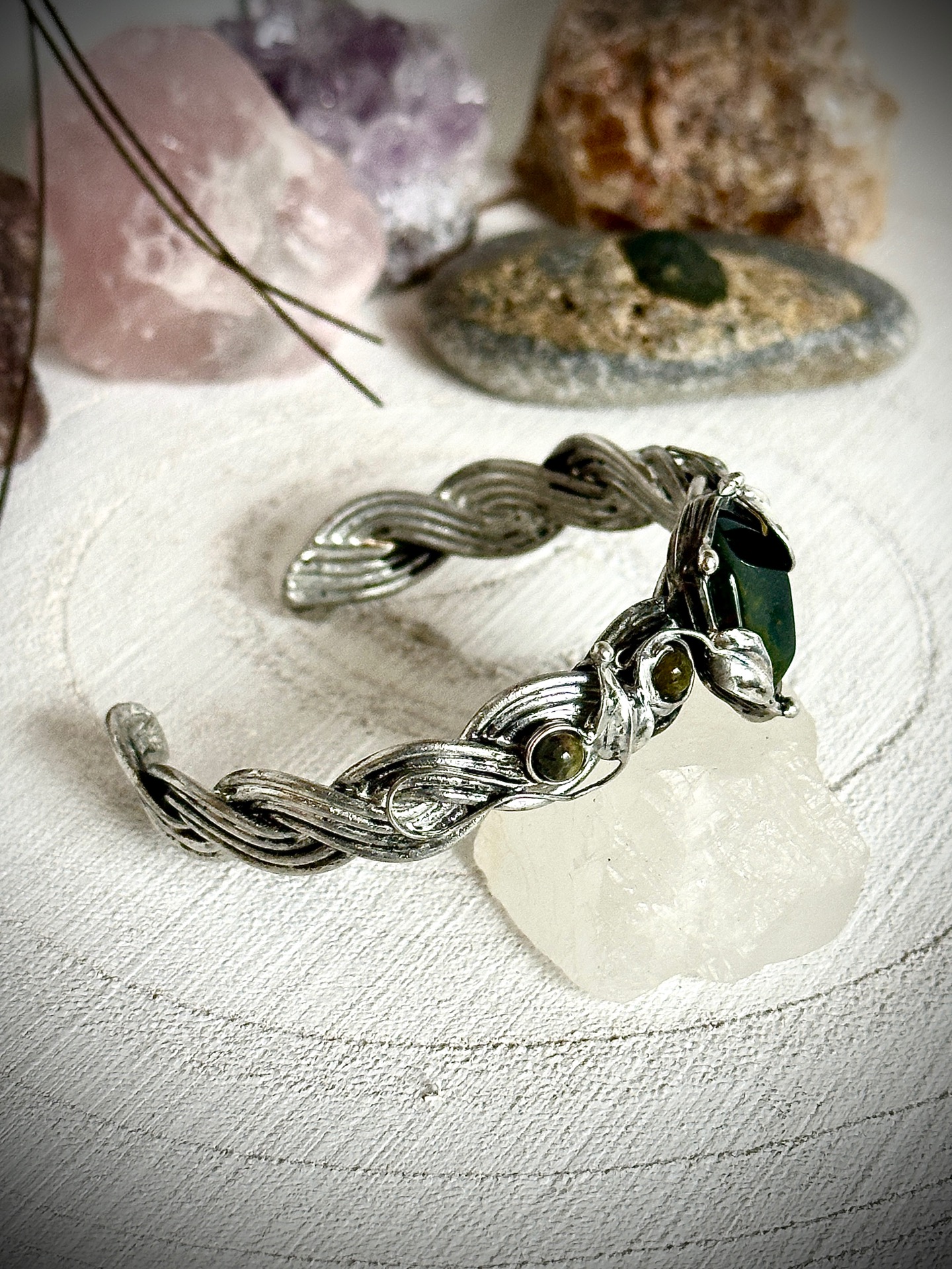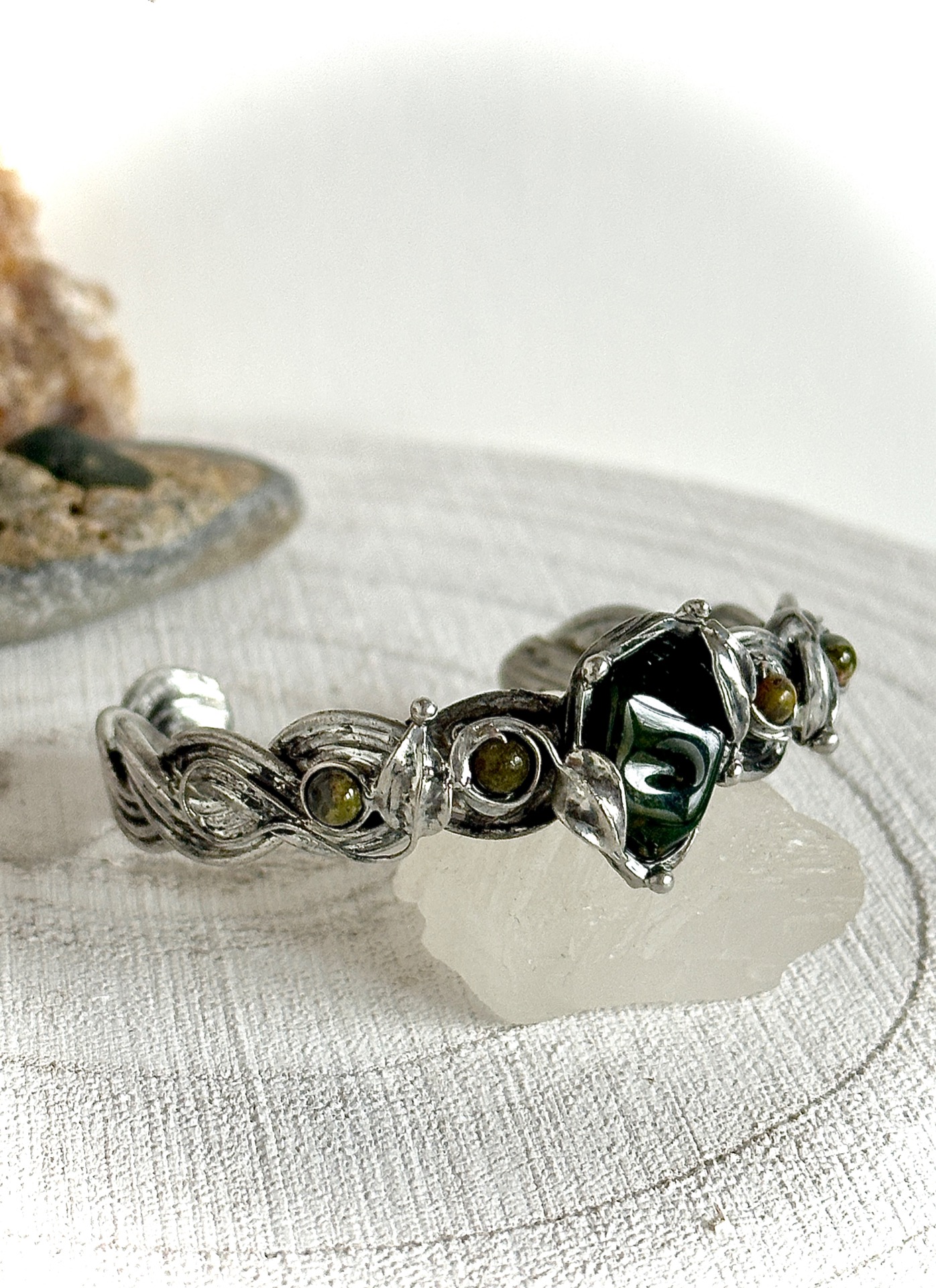 Každý detail náramku je důkladně propracovaný – od spletených linií kovu až po drobné listy, které objímají kameny, aby nesl nejen krásu, ale i energii, která doprovází jeho nositelku. Vše je vytvořeno s úctou k přírodě a ženské energii, která spojuje sílu se smyslem pro krásu.