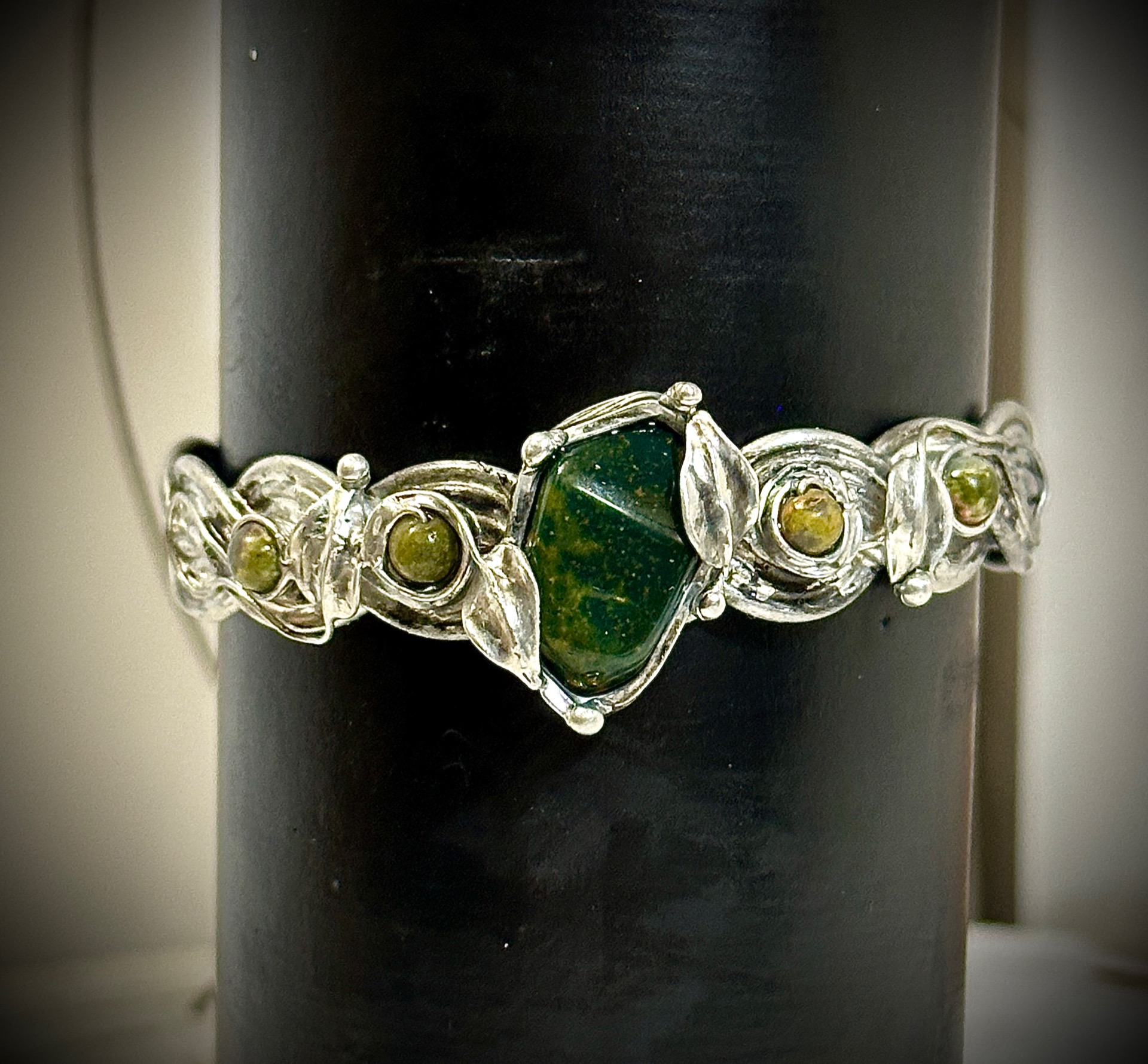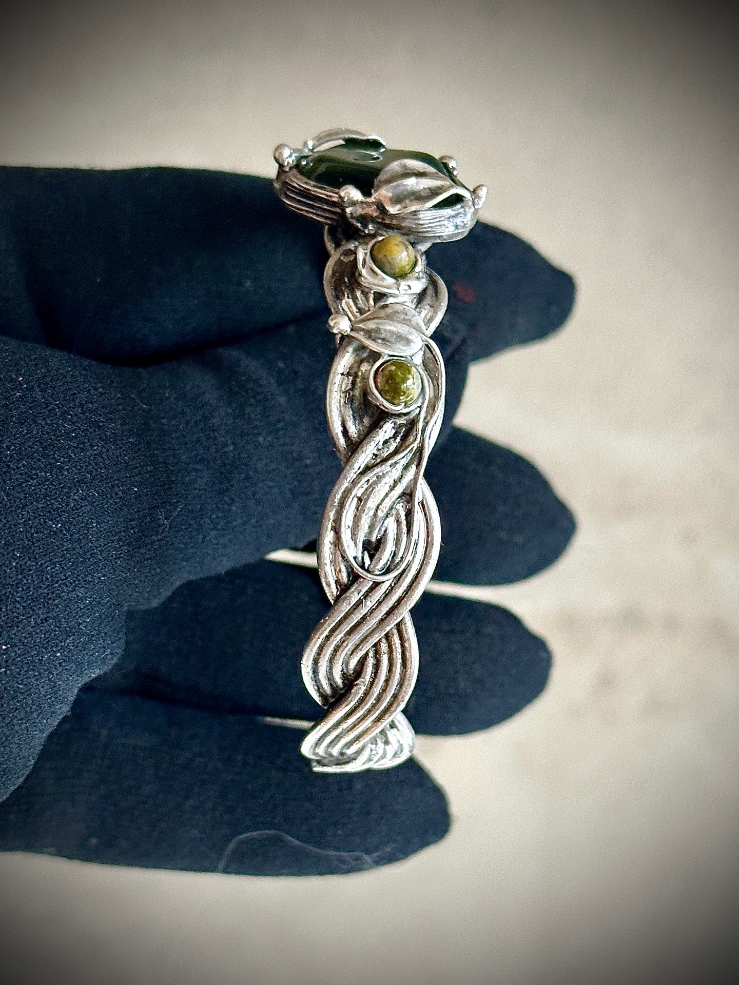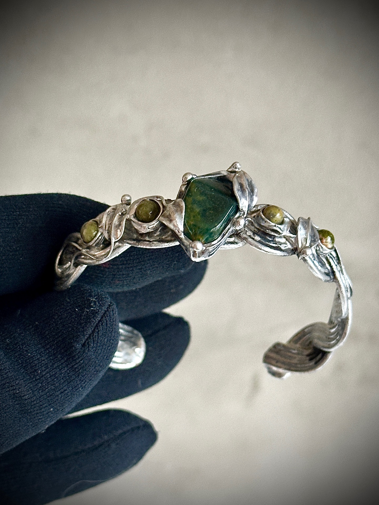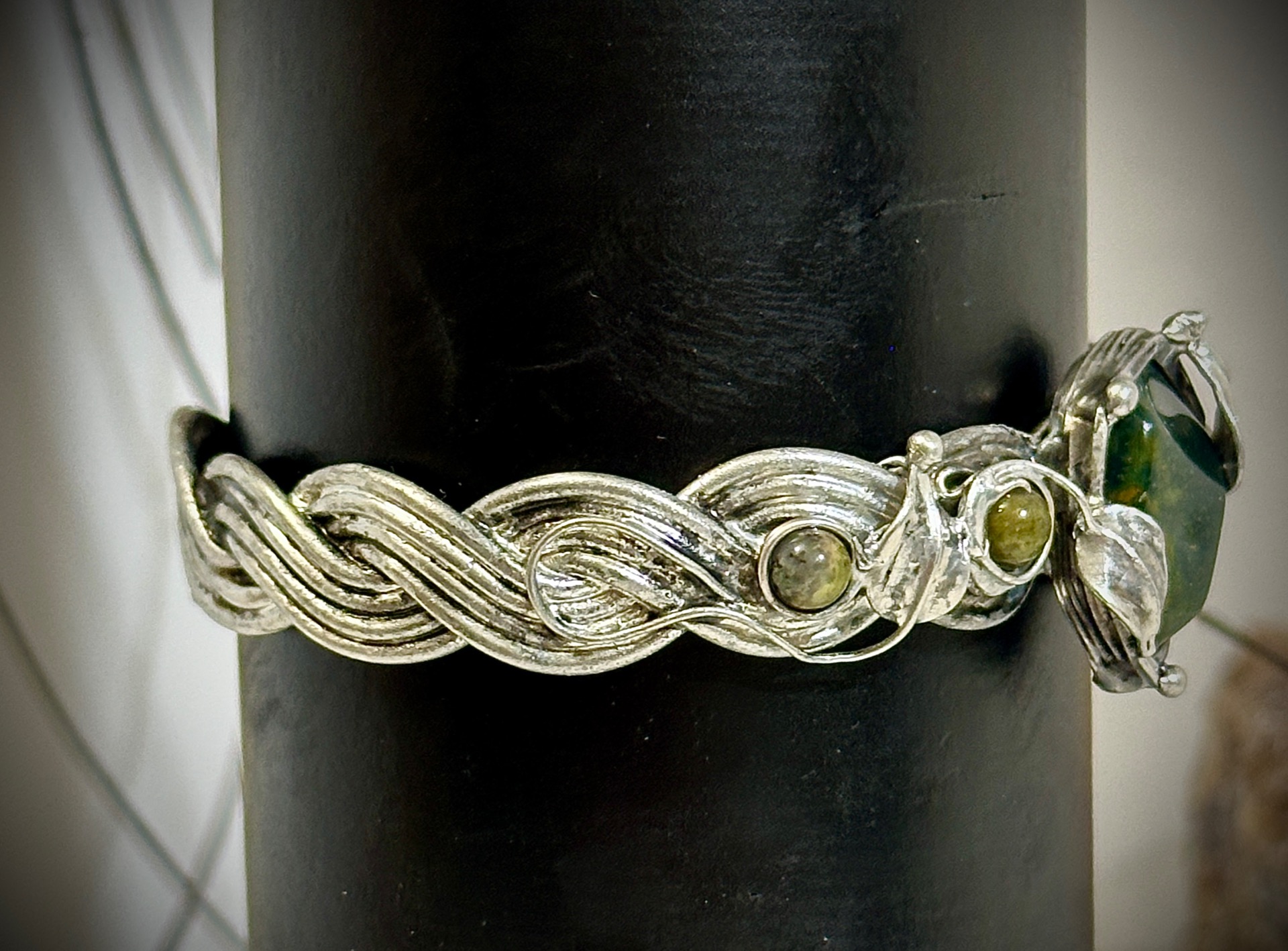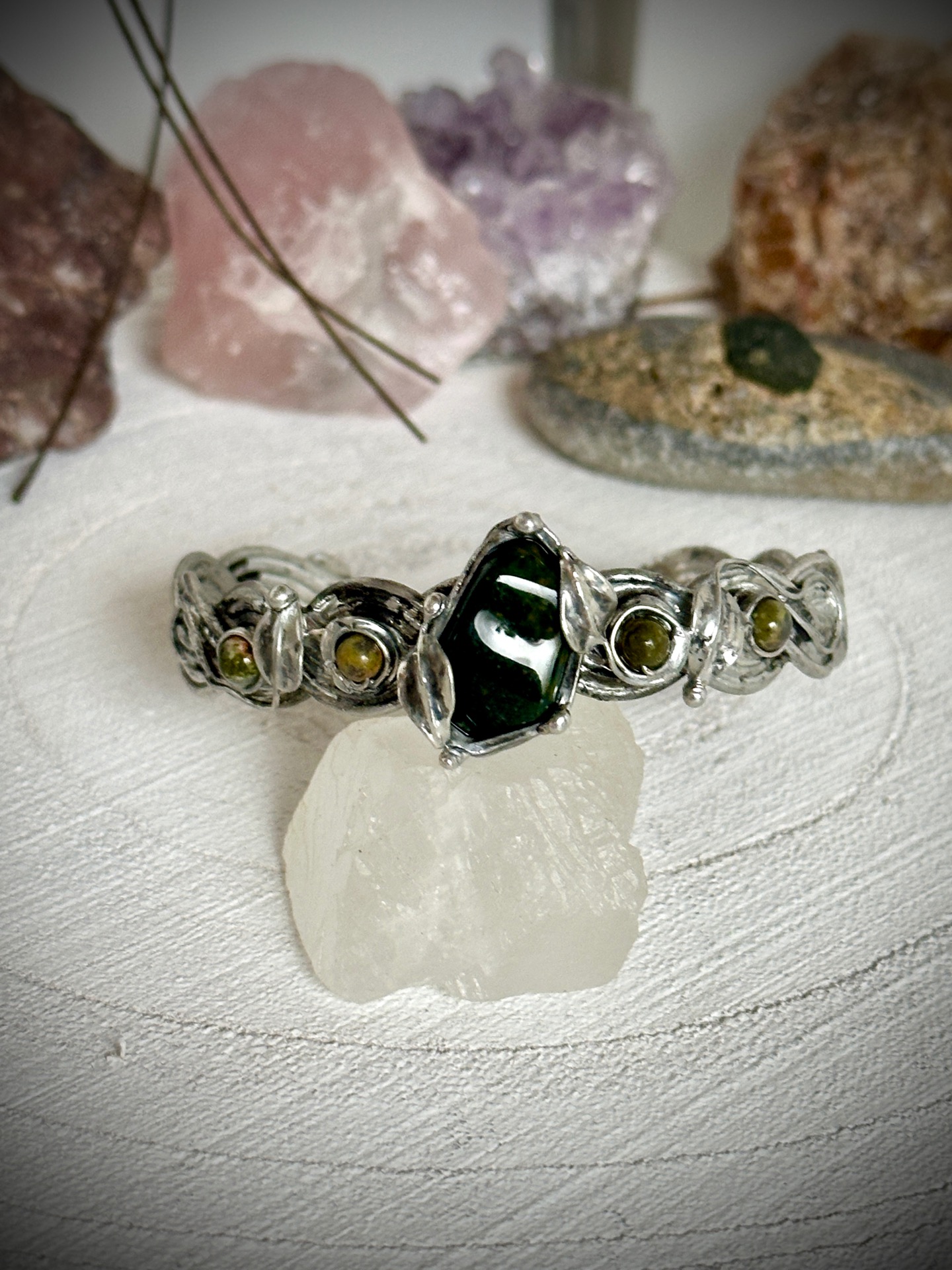 Každý detail náramku je důkladně propracovaný – od spletených linií kovu až po drobné listy, které objímají kameny, aby nesl nejen krásu, ale i energii, která doprovází jeho nositelku. Vše je vytvořeno s úctou k přírodě a ženské energii, která spojuje sílu se smyslem pro krásu.