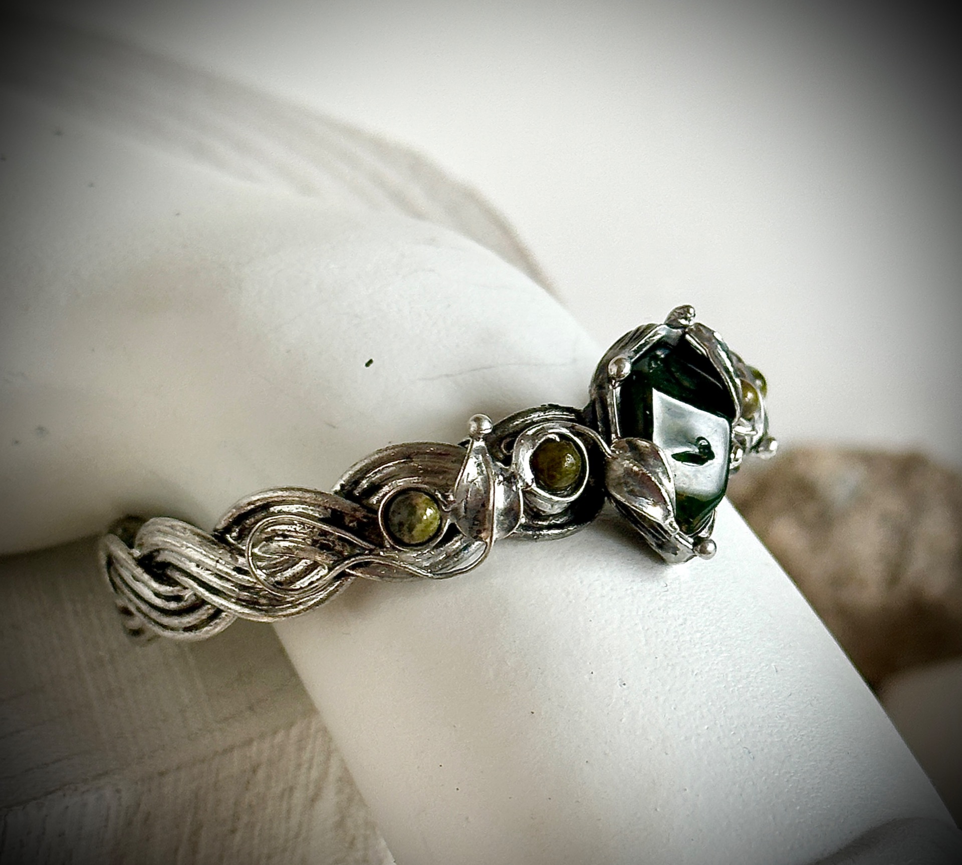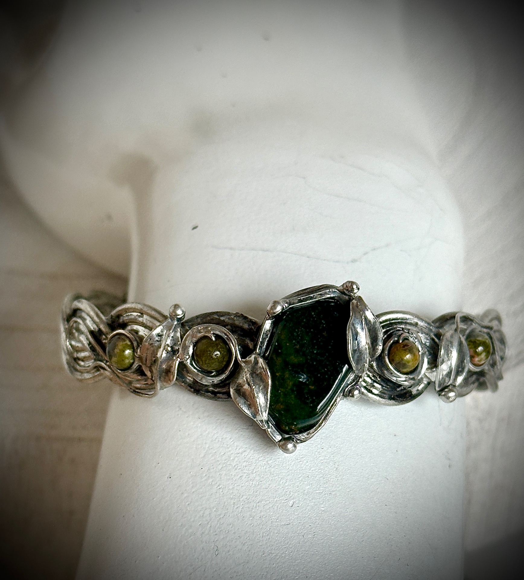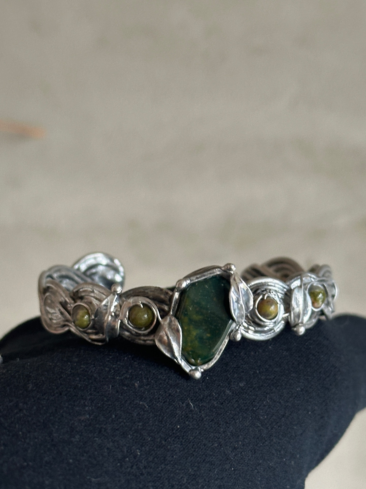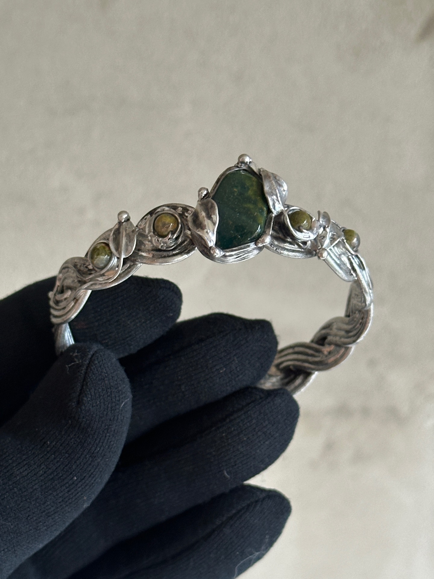Každý detail náramku je důkladně propracovaný – od spletených linií kovu až po drobné listy, které objímají kameny, aby nesl nejen krásu, ale i energii, která doprovází jeho nositelku. Vše je vytvořeno s úctou k přírodě a ženské energii, která spojuje sílu se smyslem pro krásu.