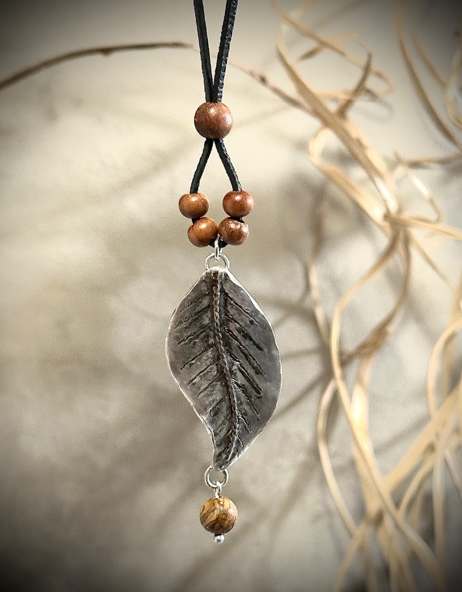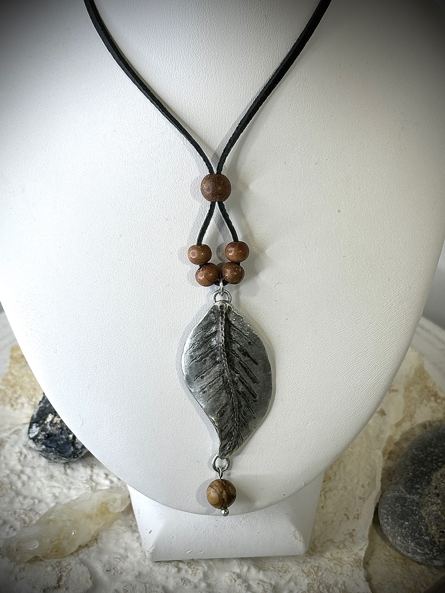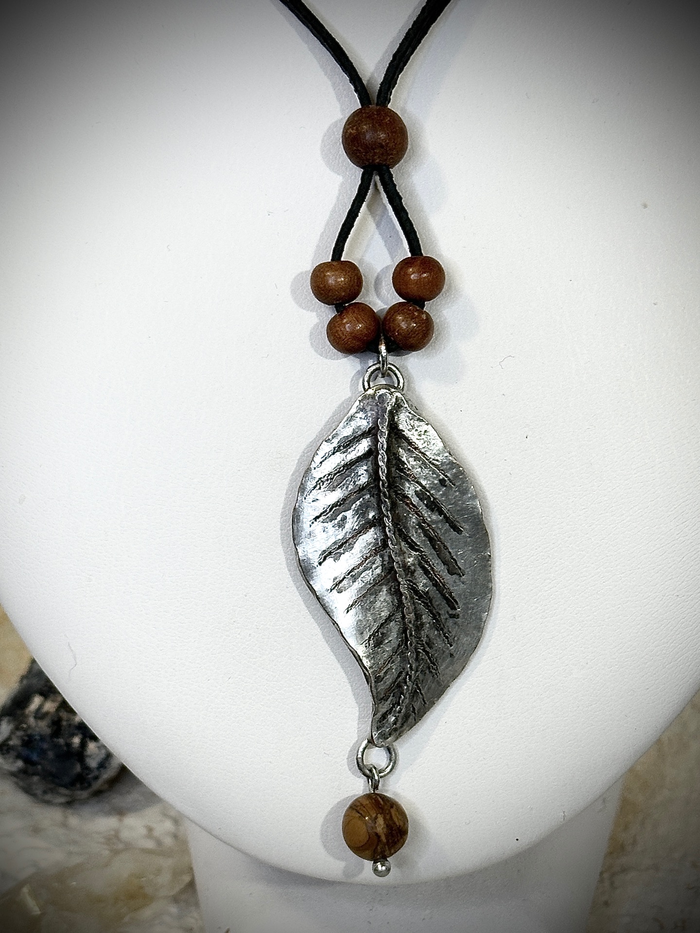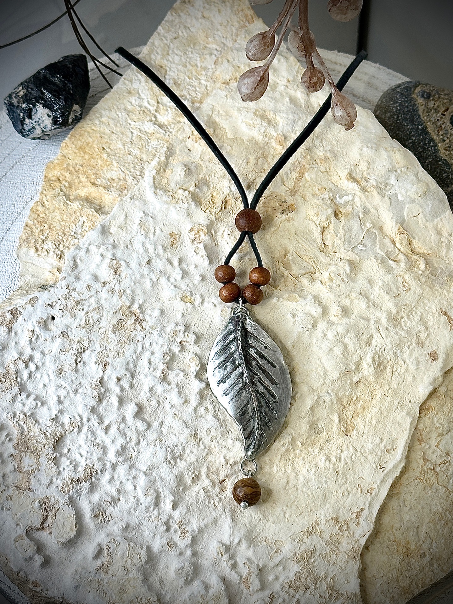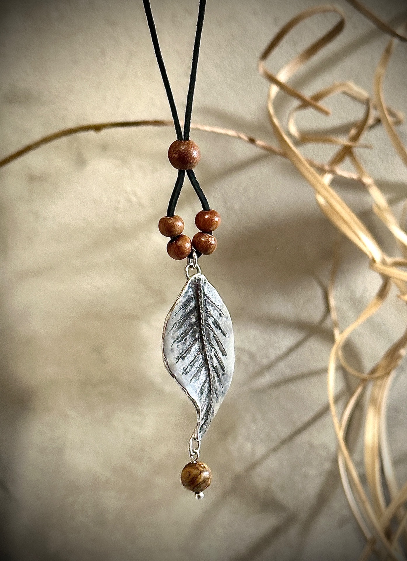 Tento ručně cínovaný šperk v podobě jemného listu jsem doplnila dřevěnými korálky a kuličkou jaspisu – kamenem stability a vnitřního klidu. Je to kousek, který propojuje přírodu, jednoduchost a tichou sílu, kterou v sobě nese každá žena.